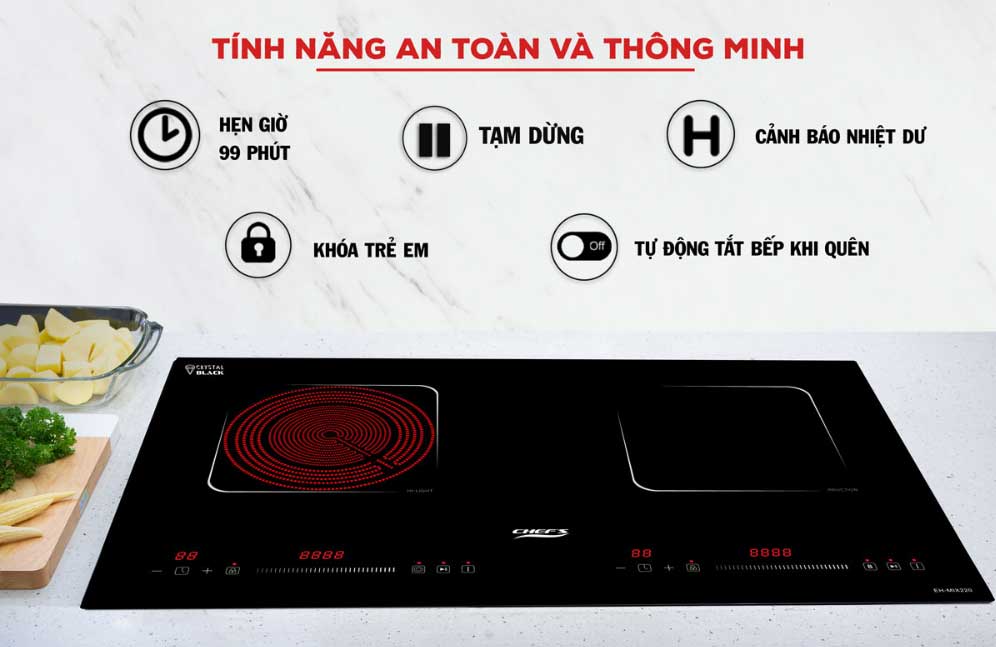 - Hẹn giờ độc lập cho từng vùng nấu, thời gian hẹn đến 99 phút