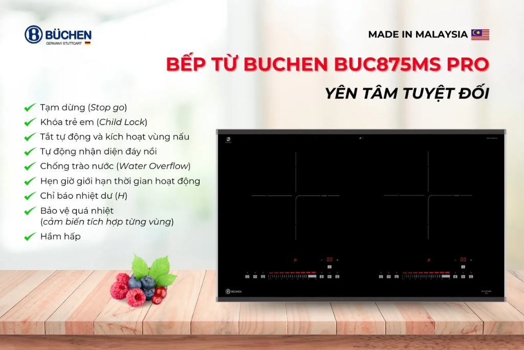 - Bảo vệ quá nhiệt (cảm biến nhiệt độ tích hợp từng vùng nấu)