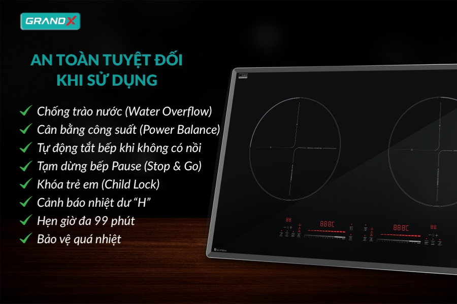 Tích hợp nhiều tính năng an toàn như Water Overflow chống trào, tự động ngắt khi không có nồi, Child Lock, Power Balance, Pause, cảnh báo nhiệt dư, bảo vệ quá nhiệt và hẹn giờ tối đa 99 phút.