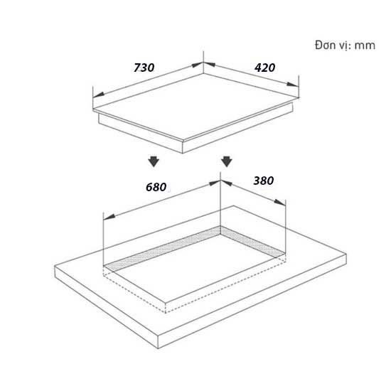 Kích thước khoét đá: 680 x 380mm