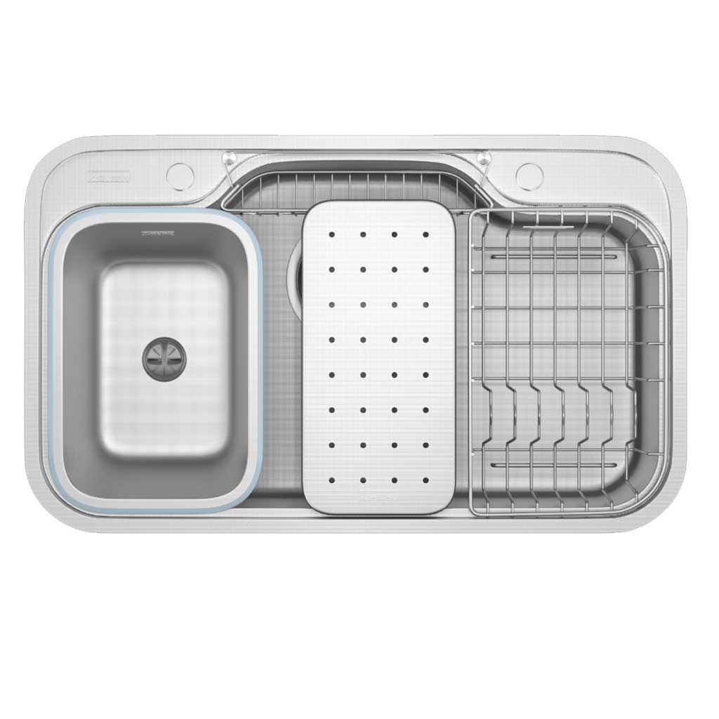 Chậu rửa bát Dekor 8044SU được tối ưu công năng nhờ thiết kế gờ hạ bậc, tích hợp phụ kiện đi kèm mang tới trải nghiệm tuyệt vời trong thao tác làm bếp.
