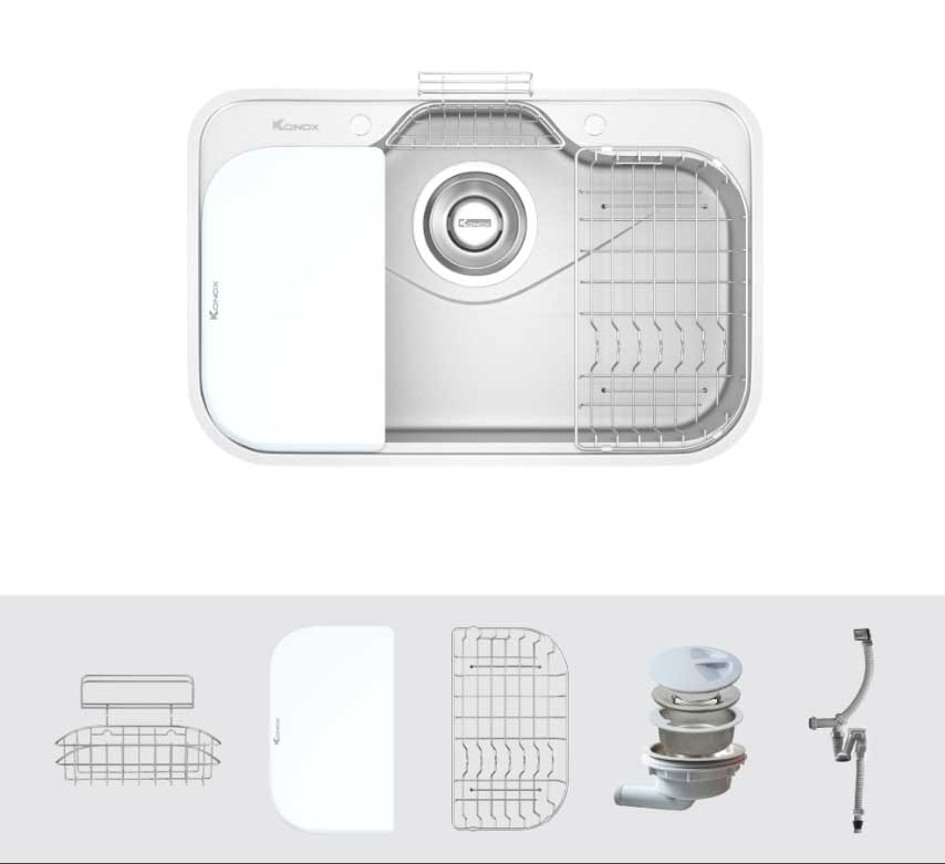 Tích hợp phụ kiện thông minh: Thớt nhựa, rổ phụ, giá úp bát, siphon