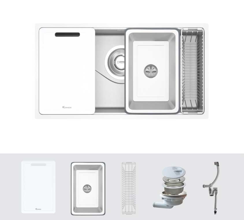Full set kèm Siphon, chậu rửa nhỏ, thớt nhựa, rổ phụ