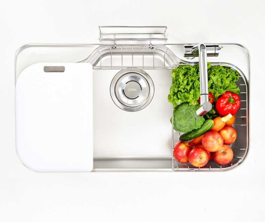 - Tích hợp phụ kiện thông minh: Thớt nhựa, rổ phụ, giá úp bát, siphon