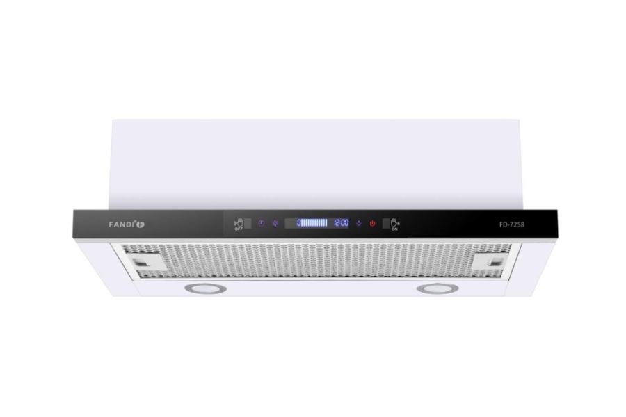 Máy hút mùi Fandi 7258 thiết kế nhỏ gọn, lắp âm tủ hiện đại, mặt kính đen tinh tế tạo điểm nhấn sang trọng cho bếp.