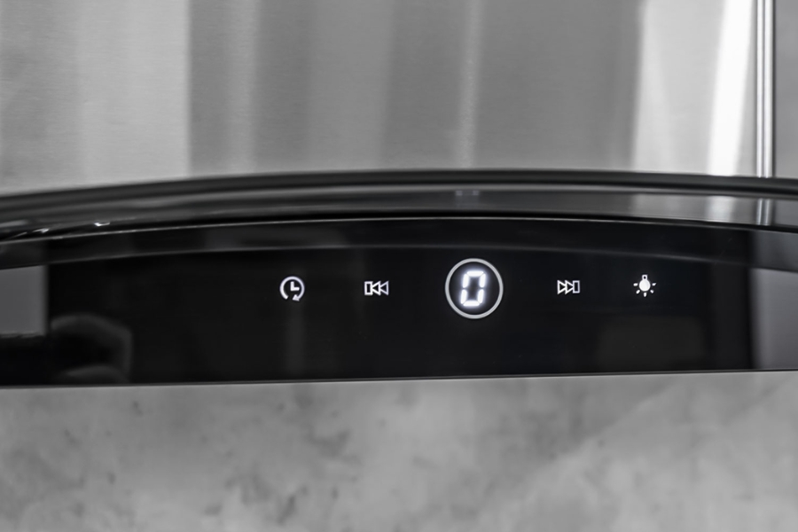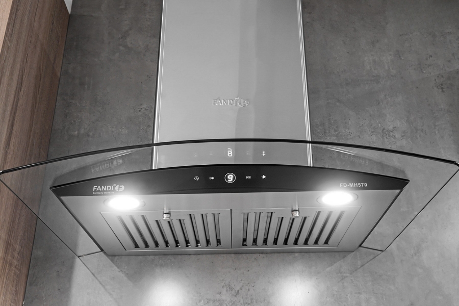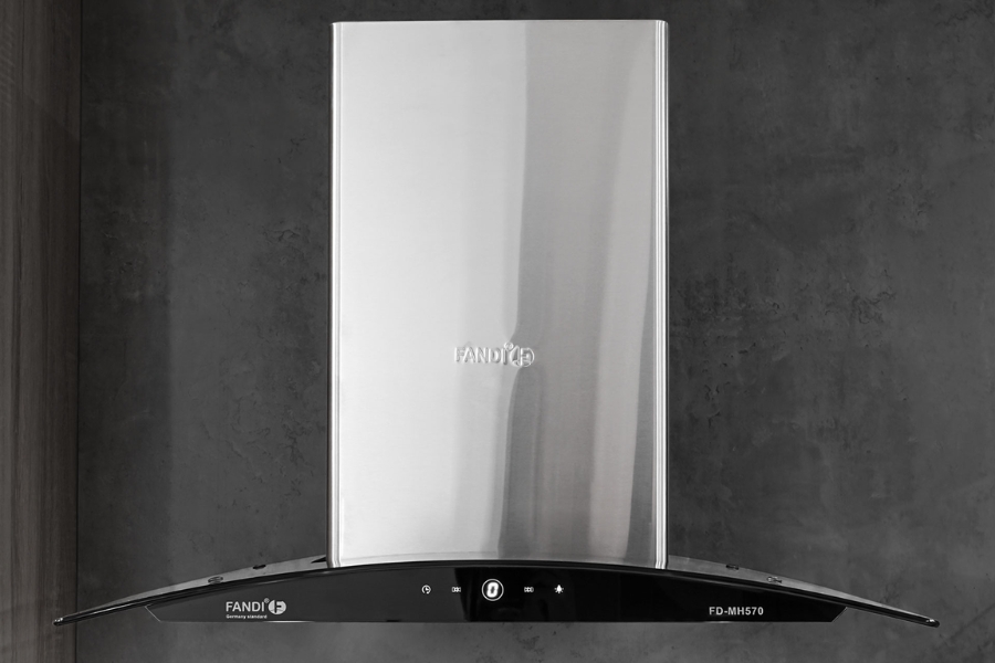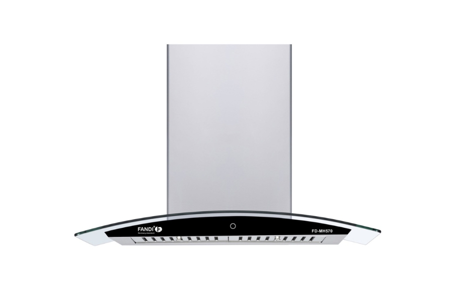 Máy hút mùi MH570 mang thiết kế kính cong chuẩn châu Âu, kết hợp tông bạc sang trọng và bảng điều khiển cảm ứng nổi bật trên nền kính đen toàn phần, giúp nâng tầm không gian bếp.