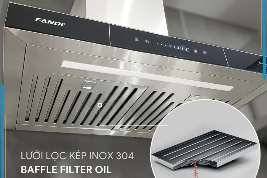 Lưới lọc kép Inox 304 bền sáng, dễ vệ sinh, kết hợp than hoạt tính khử mùi hiệu quả.