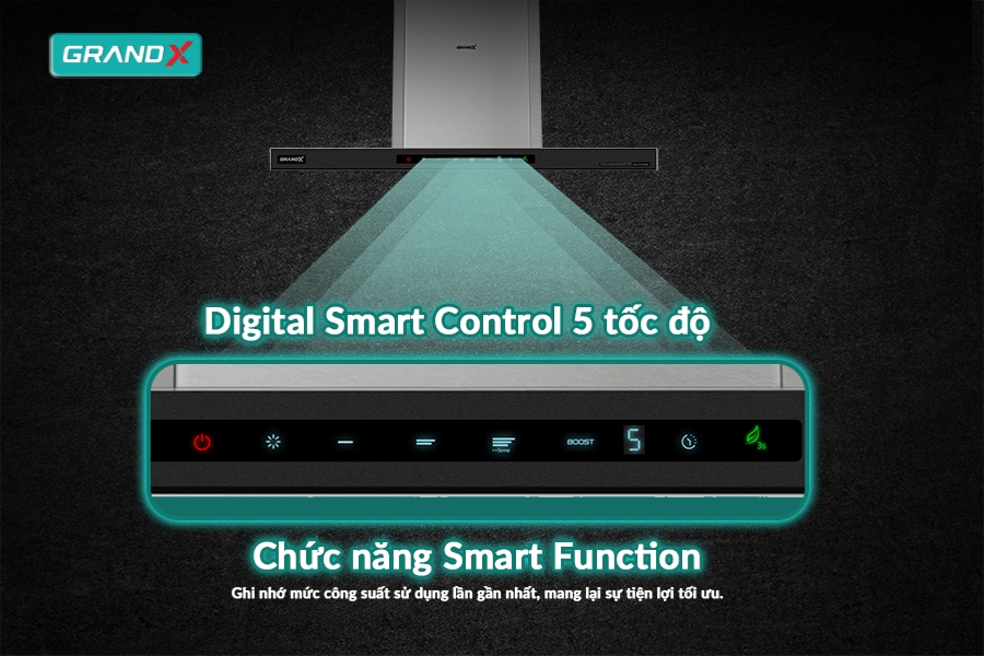 Bảng điều khiển Digital Smart Control cảm ứng hiện đại với 5 tốc độ gió và chế độ Supper Booster mạnh mẽ, cho phép điều chỉnh linh hoạt theo nhu cầu nấu nướng.