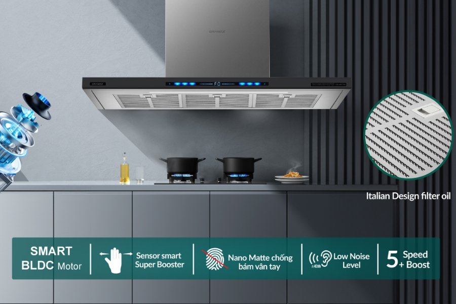 Cảm ứng Sensor Touch Smart cho phép điều khiển 5 tốc độ hút cùng chế độ Booster, xử lý nhanh mùi và dầu mỡ hiệu quả.