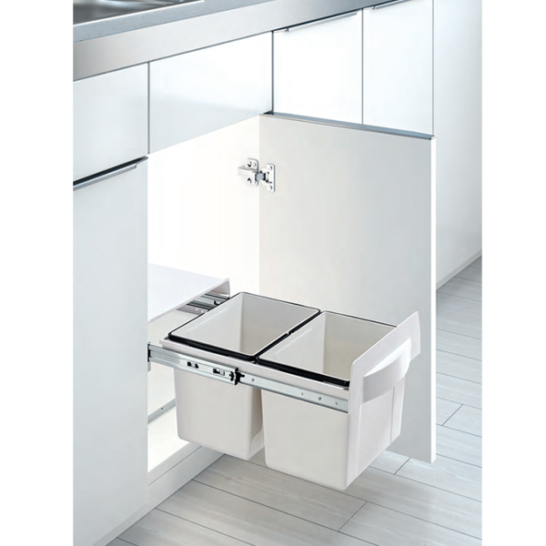 – Nắp thùng rác tự mở khi mở cửa tủ, có ray trượt giảm chấn.